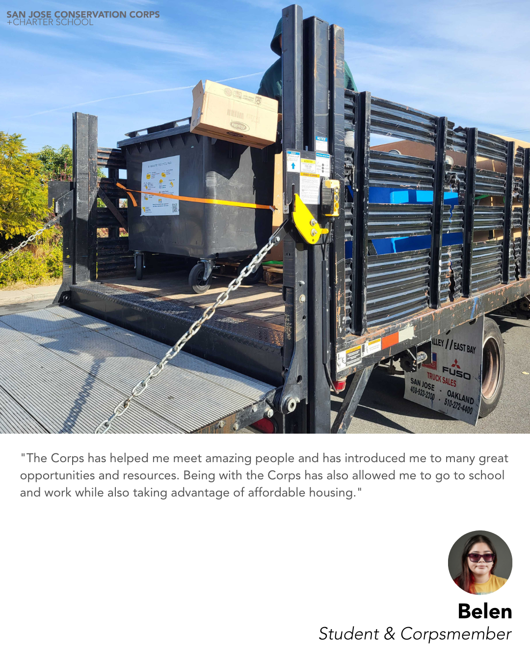 Our motto of service to self, service to community, service to environment, shows up in the corpsmember experience in many ways. Student and Corpsmember Belen explains that "being with the Corps has allowed me to go to school and work while also taking advantage of affordable housing." For her, service to self means that she’s supported in achieving her personal goals.